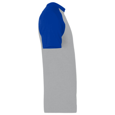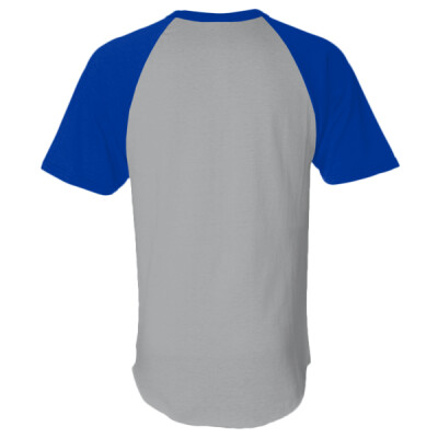4.8 ounce 50% polyester/50% cotton jersey knit * Crew neck * Contrast color neck and sleeves * Raglan sleeves * Serged fishtail bottom