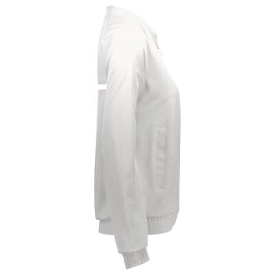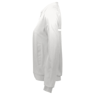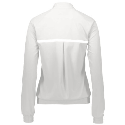 * 90% polyester/10% spandex, 4-way stretch woven fabric * Ladies' fit * Woven label * Front zipper * Low profile collar * Raglan sleeves with thumbholes for warmth * Locking front and dual inside pockets * Zippered valuables chest pocket with reflective metallic silicone welded detailing * Elastic cuffs and bottom * Water-repellent